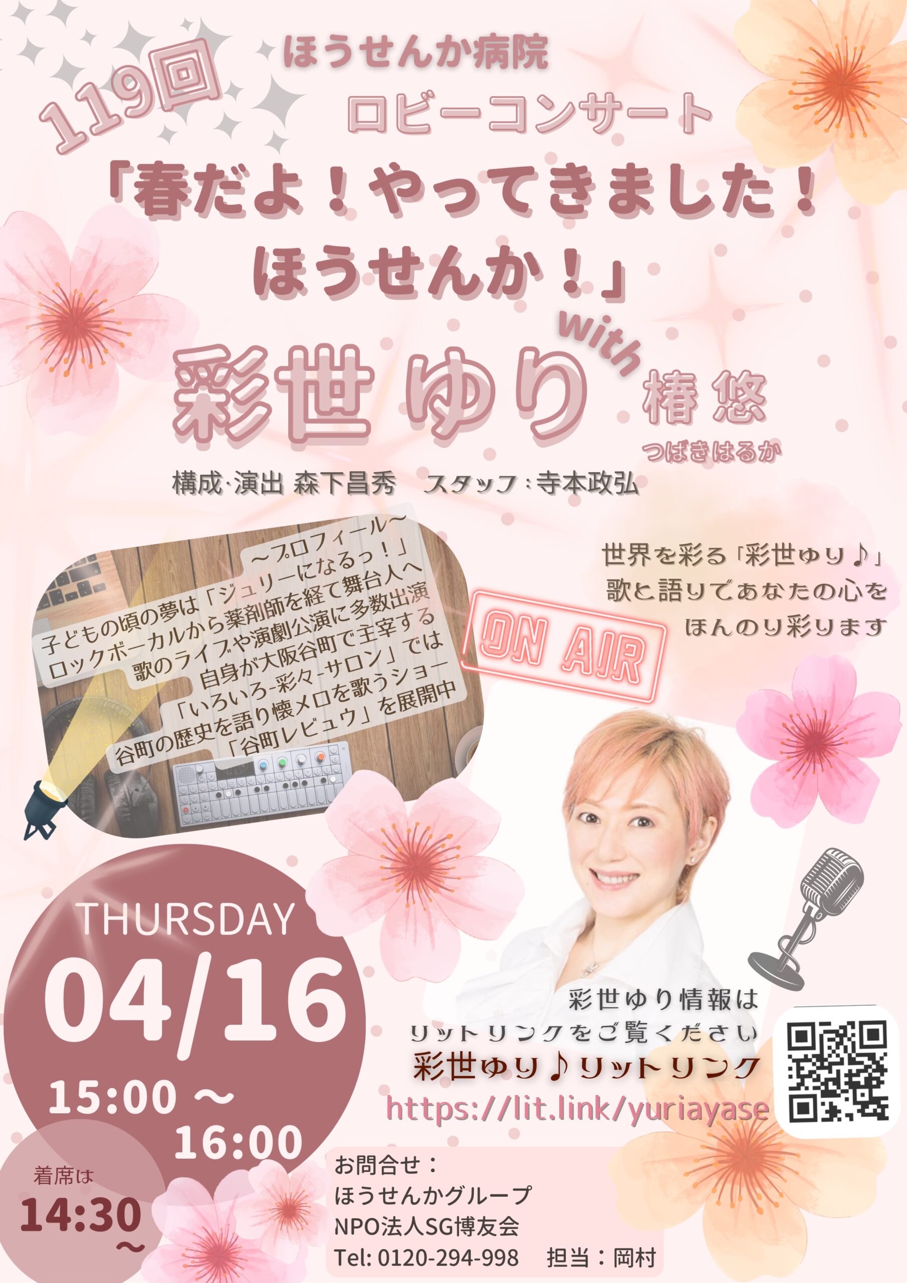 ほうせんか病院内、エントランスロビーにて、毎月コンサートを開催しております。 多種多様なジャンルの音楽を愉しむことができます。 「ロビーコンサート」は2015年秋からスタートし、毎月回を重ね、お陰様で80回を越えました。 これからも患者様やご家族の皆様に癒しの時間と空間をお届けできるように努めてまいります。